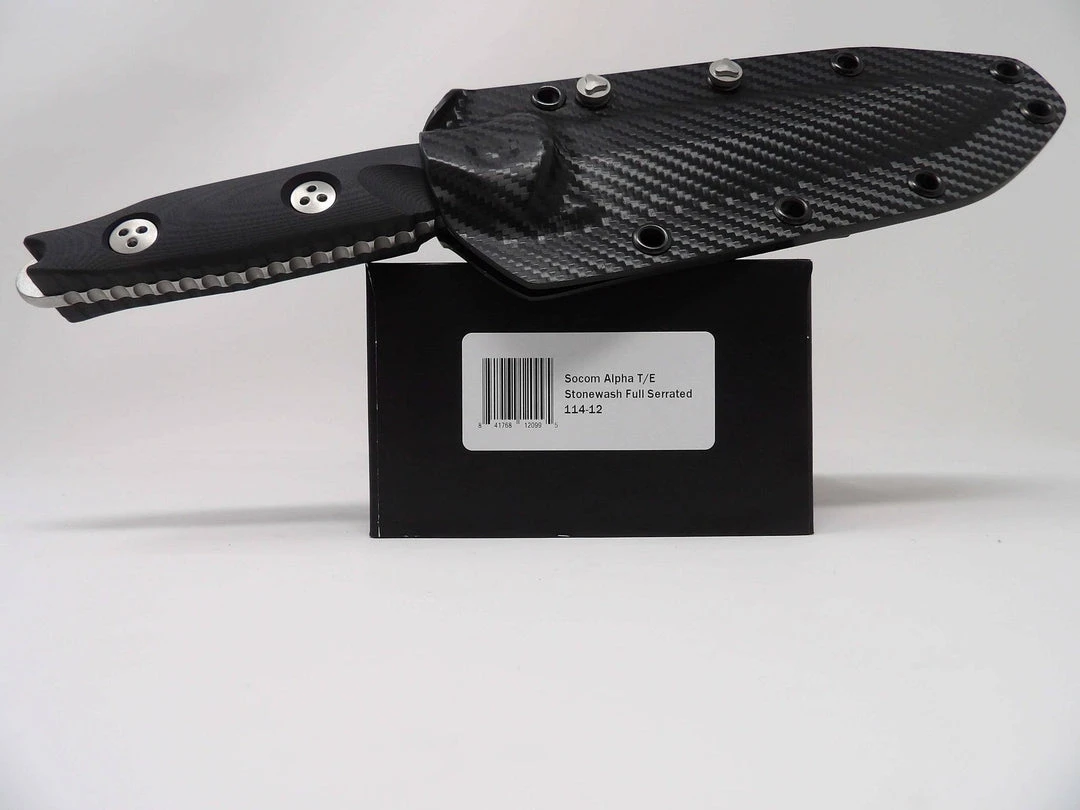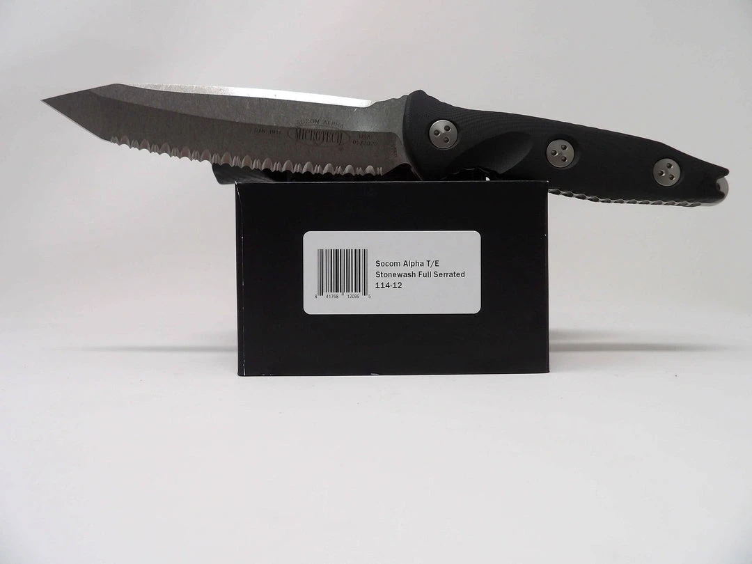 Microtech Socom Alpha Tanto Fixed Blade Knife Black handle, Stonewash Full Serrated 114-12
