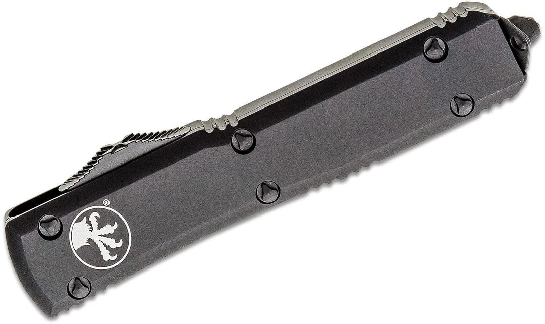 Microtech 121-1T Ultratech Tactical will forever set the standard for all out-the-front knives. Ultratech is Microtech’s original dual action out-the-front knife, and has been the foundation of their entire OTF line. Over the years, it has gone through several modifications, each time becoming more efficient and reliable. This version has the improved contoured handle with the textured thumb slide for more positive purchase. The Ultratech’s spring remains in an “at rest” position at all times except when deployed. This ensures that the compressed spring will not become fatigued, assuring users that when the knife is fired, it will operate effectively. Ultratech can take many different forms; it can be topped with a standard machined aluminum top or a piece of carbon fiber. All the hardware of this knife including the actuation button and pocket clip is black, dubbing this the Tactical Ultratech model. The Ultratech’s light weight, one handed open and close action, slim shape, and scalpel sharp blade make it a one of a kind knife, only available through Microtech. This knife has proven time and again that it can withstand any obstacle. Only time will tell what the next step will be for the Ultratech series.