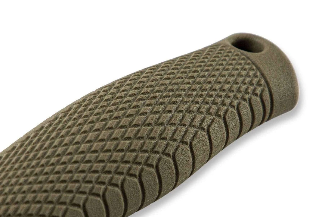 This full-tang fixed blade has a textured ranger green Santoprene handle which all but eliminates hot spots for a super comfortable grip, even after extended use. It has a handle thickness of 0.8” and a handle length of 4.5”. There’s a generous lanyard hole for attachment and this knife comes with a black leather sheath with a dangler attachment as well as a ferro rod loop.
