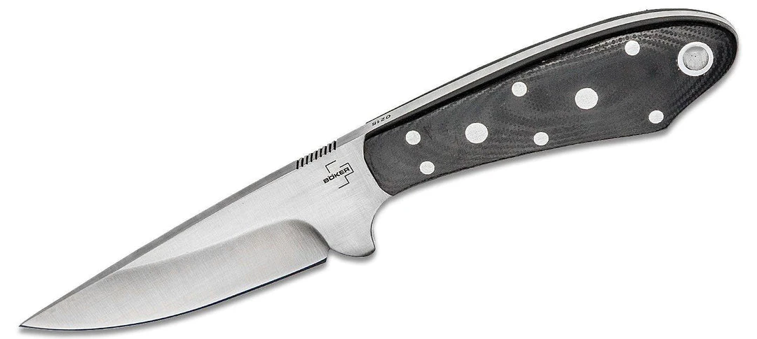 Known for his unusual and innovative designs, custom knifemaker Mickey Yurco has an incomparable sense of ergonomics and exceptional solutions. The Boker Plus Backdrop is no exception and convinces with a concept designed for speed and flexibility. The perfectly fitting Kydex sheath can be carried with the double-sided hook in the front trouser pocket, with the leather plate in the back pocket, or with the ball chain as a neck knife around the neck. The hook and plate also prevent the sheath from slipping out of the pocket when the knife is pulled, thus ensuring that the knife is always ready for use. In addition, the freely transportable backdrop can thus be carried just as comfortably and discreetly as a folding knife. The handy backup knife is equipped with a satin-finished D2 blade and black G10 handle scales with decorative rivets. The ergonomic finger recess and jimping in the thumb rest area increase work safety. With reinforced lanyard hole.