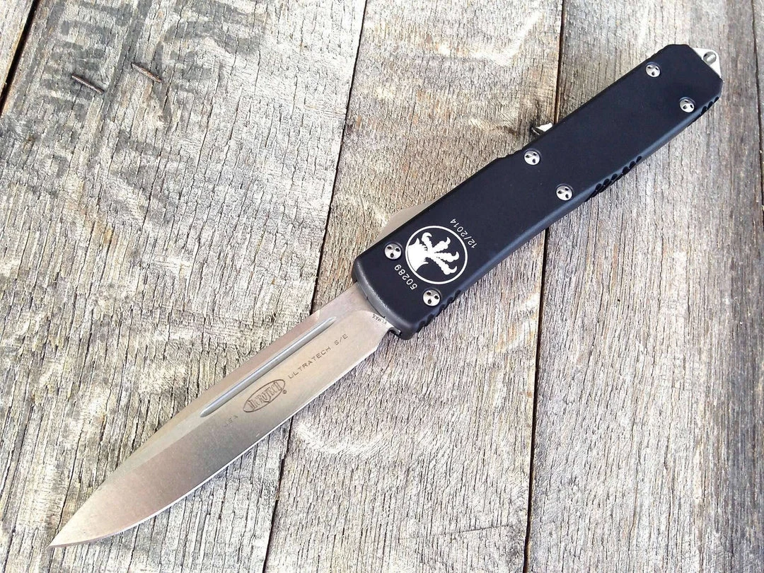 This Ultratech features a drop point blade with a satin finish and a plain cutting edge. It has a contoured, black anodized 6061-T6 aluminum handle with a bead blast finished pocket clip, glass breaker, and stainless steel hardware. Microtech equipped this version of the ever popular Ultratech D/A OTF knife with a smooth, contoured handle design that promotes increased comfort during use. This updated model provides the same dimensions, hardware, and durability offered by the “Tri-Grip” variation, but goes easier on the hands and pockets. For those unfamiliar with the Ultratech, it’s a fully automatic knife with a double-action out-the-front mechanism, meaning the thumb slide deploys the blade and retracts it as well. The Ultratech knife from Microtech has set the bar for all OTF knives.