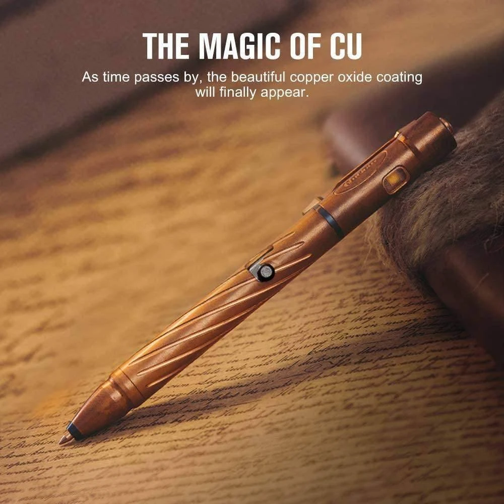 Perfect for Indoors or Outdoors, this limited edition copper pen and light is perfect for Inspection, Work, Repair, and Homework. This Olight OPEN 2 CU is an EDC pen with an illumination function. It can be either integrated or divided into two functionally independent parts: a pen and a flashlight. The pen, with a 0.7mm tip, can write smoothly, and the ink is legible. The L-type bolt action design is used to quickly extend and retract the pen tip. Single-click the switch at the top can activate the LED flashlight on the upper part, which delivers 4 brightness levels from 5 lumens to 120 lumens. And the flashlight can be placed aside for writing in the dark. With a built-in rechargeable lithium-polymer battery, popular USB-C charging, and charging indicator. The OPEN 2 CU is durable for everyday carry on duty, patrol, and everyday tasks. Keep OPEN 2 CU with you to light up your instant inspiration.