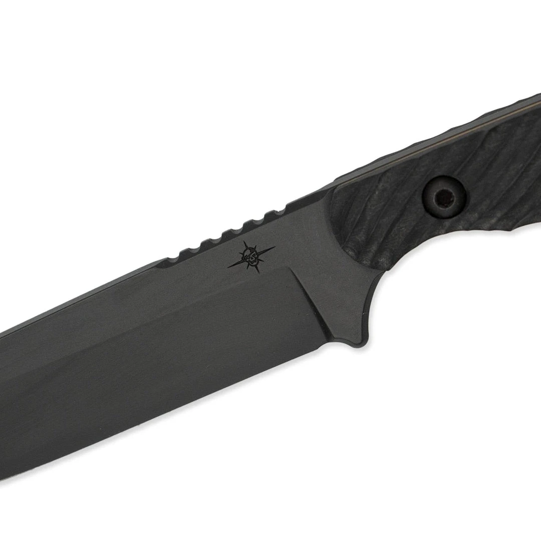 The edge features a 2.75″ straight for fine work, and a razor-sharp 1.75″ radius to the tip for traditional blade work. Its KG Gunkote finish provides excellent abrasion, chemical, and impact resistance, and the blade shape allows for much more steel mass behind the edge, which translates to a longer sharpening life and edge impact resistance. A perfect 90-degree spine, from the tip all the way to the thumb jimping, provides more surface area for hammering and ferro rod sparking.