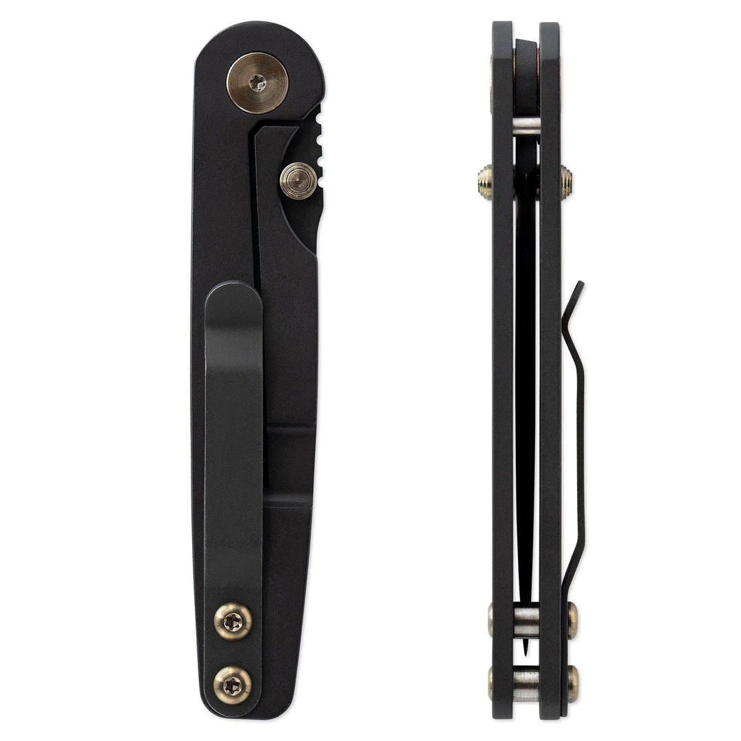 Made entirely at our San Diego manufacturing facility, its lightweight titanium handles are 1/8” thick, while all of the hardware is precision counterbored to fit flush along the scales, providing a sleek profile. In the closed position, the titanium thumb studs act as a secondary stop for the blade, while also protruding slightly above the handle scale, to allow easy opening.