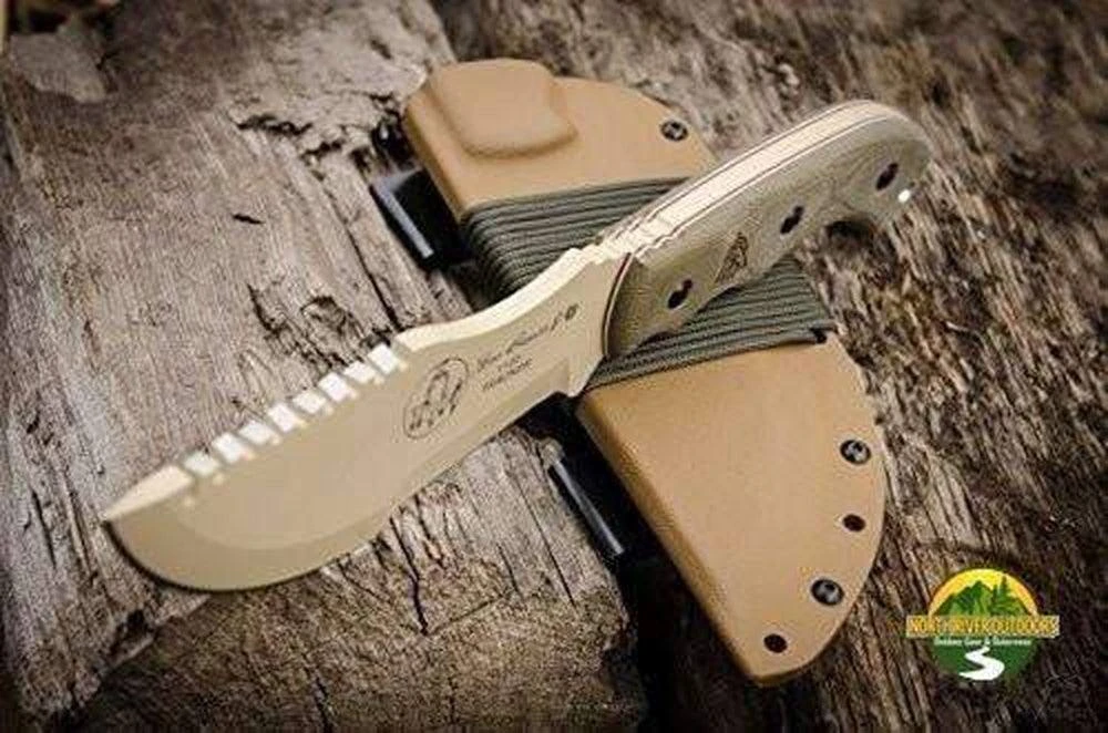 Designed by Tom Brown and featured in the movie “The Hunted” as well as the cover of BLADE Magazine, this is one of the most versatile survival knives ever made. It is designed to chop, saw, skin, engrave, break wire and more. It is made from thick carbon steel and features a milled Micarta handle and tough Kydex sheath. Your chopping pressure can be varied by holding the handle at different points. The knife is made entirely in the USA. One of the most popular knives from TOPS, the Tom Brown Tracker speaks for itself.