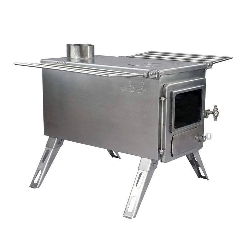 The larger version of the best selling Nomad Stove, the Winnerwell Nomad Large features a rectangular firebox with a large door window, nesting 4-leg design, and quickly deploys to heat small spaces. Made with quality 304 stainless steel, the Nomad Large is an excellent heating and cooking solution in compatible canvas tents and other other recreational shelters. The 4-leg design gives the Nomad a smaller footprint than the Woodlanders, making it a good option for small spaces where a fireproof hearth area is used to reduce required clearances.