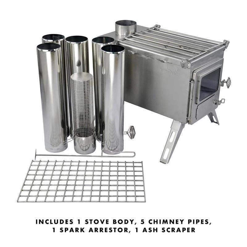 - Highly portable- Nesting legs and shelves fold flat to the stove body; 5 pipe sections, spark arrestor, and an ash scraper stow inside the stove body