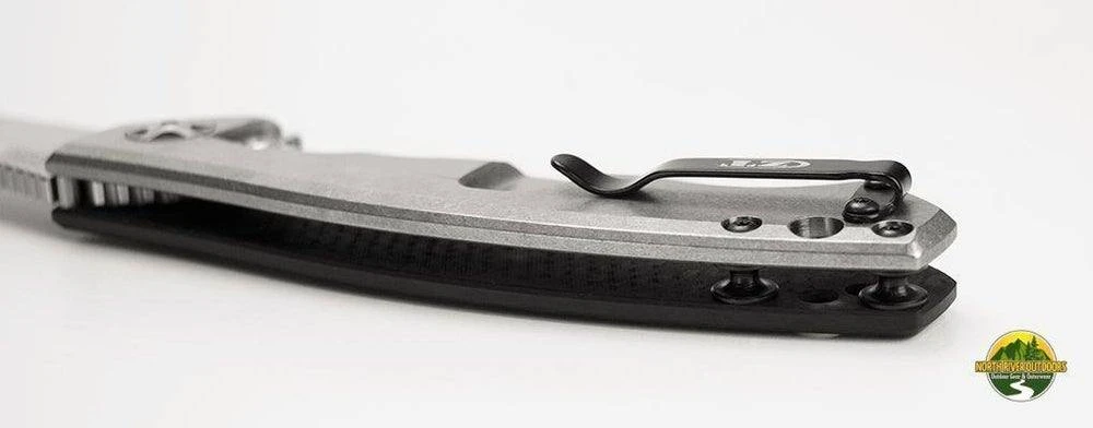 - Handle: Carbon fiber front, titanium back, stonewashed finish